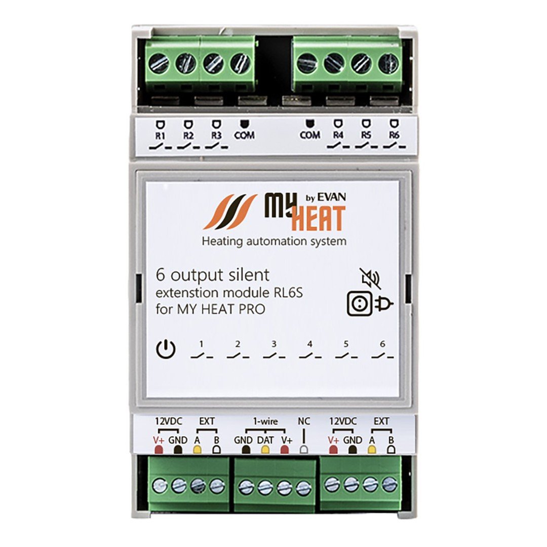 Модуль MY HEAT RL6S подключается к контроллеру по проводной шине и предназначен для бесшумной коммутации дополнительных шести выходов электрической нагрузки посредством симистора. Для связи с контроллером оснащен интерфейсом RS-485 (посредством внутреннего протокола MY HEAT). Модуль оснащен интерфейсом 1-wire для подключения шлейфа цифровых датчиков температуры. Ключевой особенностью модуля является встроенная функция ПИД-регулирования до 3-х контуров одновременно. Модули расширения предназначены для использования в автоматизированных системах отопления и горячего водоснабжения под управлением теплового контроллера MY HEAT. Модули расширяют возможности контроллера MY HEAT, предоставляя дополнительные функции, интерфейсы и порты ввода/вывода.