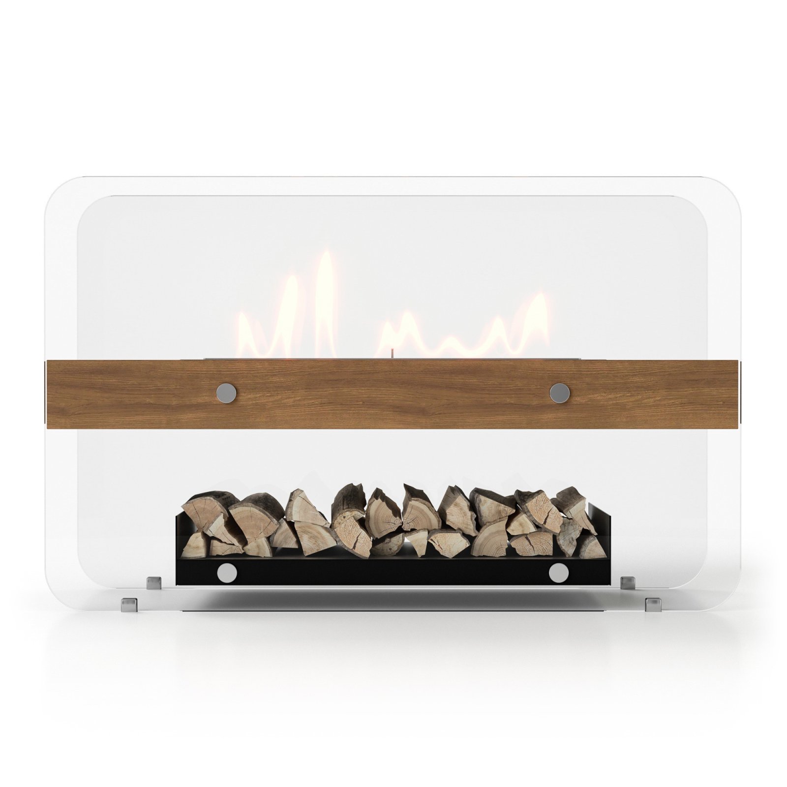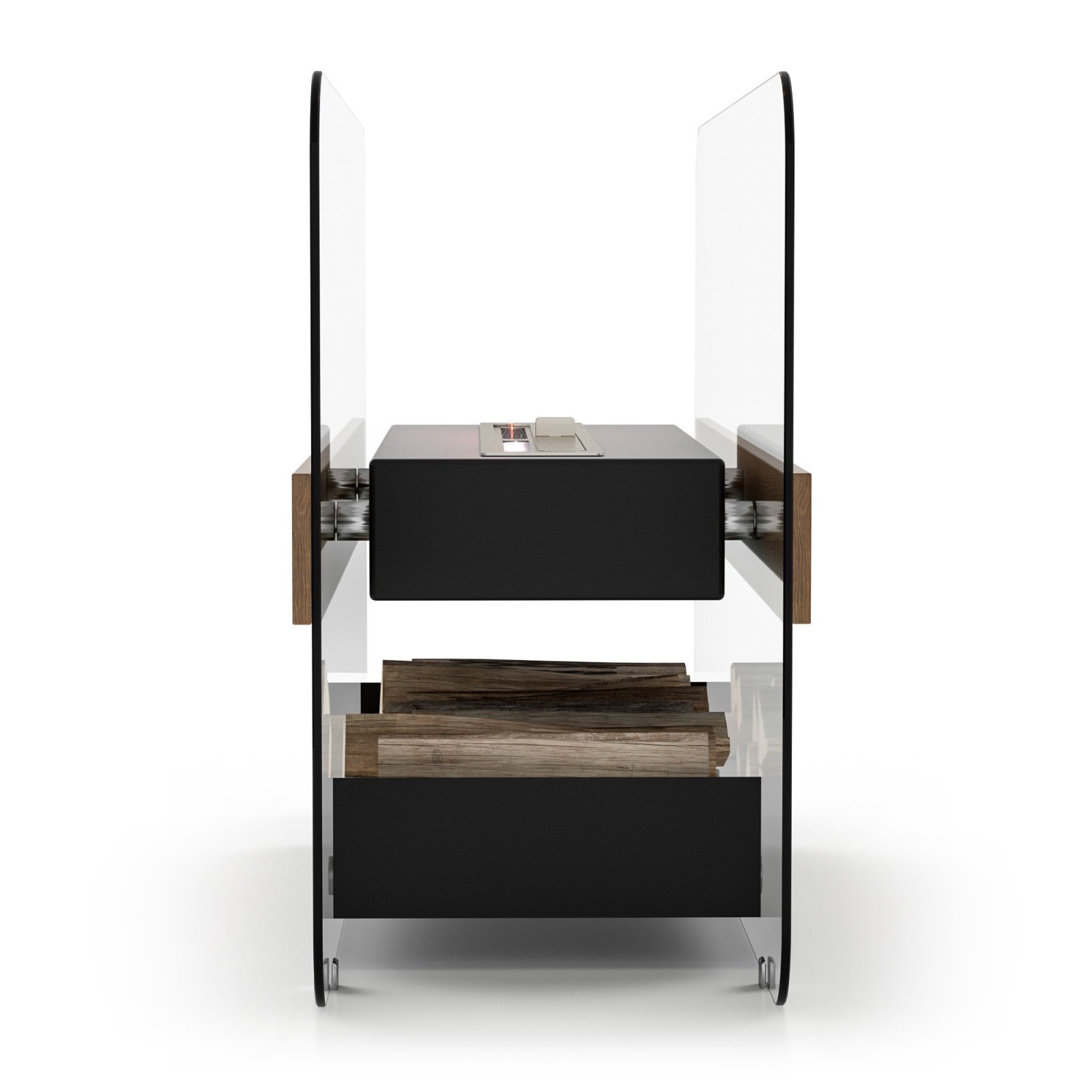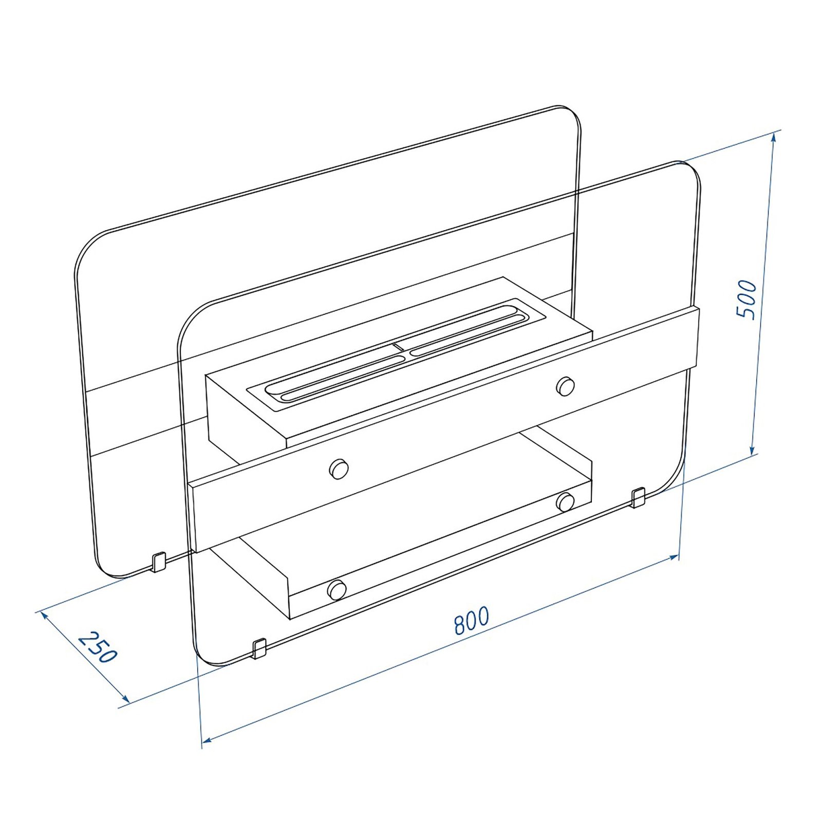 Биокамин представляет собой сборную напольную модель оригинального дизайна из закаленного прозрачного стекла и топливного блока на подиуме, закрепленного на 12 дистанционнных держателях.